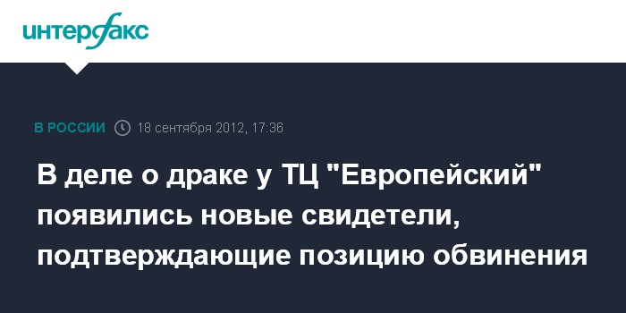 Москва. 18 сентября. INTERFAX.RU - В деле о массовой драке у торгового центра "Европейский" в Москве появились два новых свидетеля, которые подтверждают позицию обвинения, сообщил во вторник "Интерфаксу" источник, знакомый с ходом расследования.