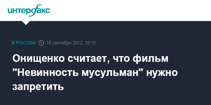 Москва. 18 сентября. INTERFAX.RU - Глава Федеральной службы по надзору в сфере защиты прав потребителей и благополучия человека (Роспотребнадзор) Геннадий Онищенко считает правильными планы признать в России экстремистским фильм "Невинность мусульман", который вызвал беспорядки во многих странах мира.