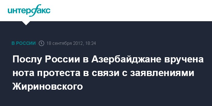 Баку. 18 сентября. INTERFAX.RU - МИД Азербайджана направил ноту протеста России в связи с заявлениями лидера ЛДПР Владимира Жириновского, отмечается в пресс-релизе внешнеполитического ведомства Азербайджана.