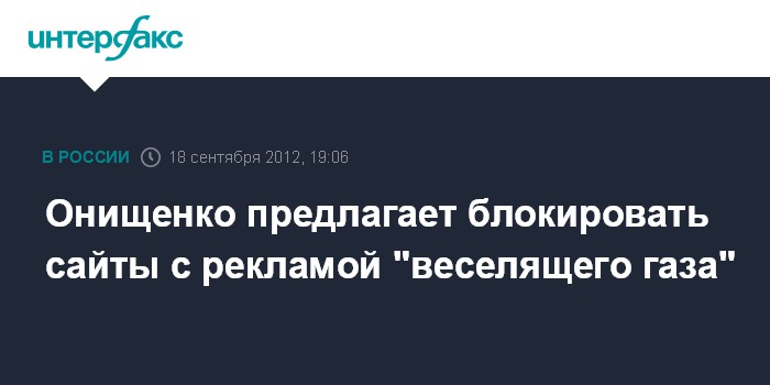 Москва. 18 сентября. INTERFAX.RU - Руководитель Роспотребнадзора, главный государственный санитарный врач РФ Геннадий Онищенко призвал блокировать сайты с рекламой так называемого "веселящего газа".