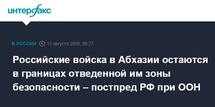 Нью-Йорк. 12 августа. INTERFAX.RU - Постпред России при ООН Виталий Чуркин заявляет, что российские войска в Абхазии остаются в границах отведенной им зоны безопасности. "Наши войска в Абхазии остаются в границах предписанной им зоны безопасности. Наши военные категорически отрицают все панические сообщения о том, что они якобы взяли город Гори или направляются в Тбилиси", - заявил В.Чуркин по окончании заседания Совета безопасности ООН во вторник, на котором обсуждалась резолюция по Южной Осетии. Постпред РФ при ООН добавил, что "нужно весьма критически относиться к подобного рода информации".
