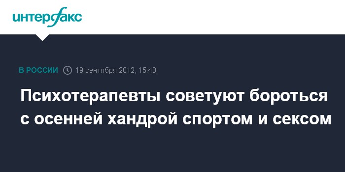 Санкт-Петербург. 19 сентября. INTERFAX.RU - Яркие эмоции, занятие спортом, вкусная и здоровая пища, а также секс помогут побороть осеннюю депрессию, убежден руководитель Центра поведенческой неврологии Института мозга человека имени Бехтеревой профессор Леонид Чутко.