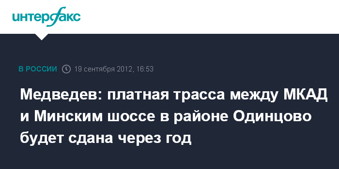 Московская область. 19 сентября. INTERFAX.RU - Платная трасса в обход подмосковного города Одинцово, которая свяжет МКАД с Минским шоссе в Подмосковье, должна быть сдана в сентябре следующего года, заявил премьер-министр России Дмитрий Медведев во время посещения трассы, где он и проведет совещание по развитию Московского транспортного узла.