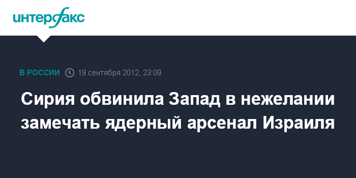 Вена. 19 сентября. INTERFAX.RU - Сирийская делегация на конференции Международного агентства по атомной энергии (МАГАТЭ) обвинила страны Запада в том, что они закрывают глаза на запасы ядерного оружия в Израиле, сообщают в среду западные СМИ.
