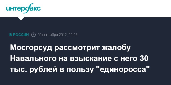 Москва. 20 сентября. INTERFAX.RU - Мосгорсуд в четверг рассмотрит апелляционную жалобу оппозиционера Алексея Навального на решение нижестоящей инстанции, взыскавшей с него 30 тыс. рублей в пользу члена "Единой России" за негативные слова о партии.