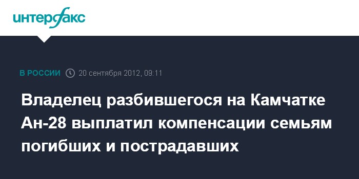 "Все семьи 12 пассажиров и двух членов экипажа получили по 100 тыс. рублей, в том числе и родственники двух мужчин, приехавших на Камчатку в командировку из других регионов и погибших в этом авиакрушении", - сообщил агентству "Интерфакс - Дальний Восток" представитель юридического отдела авиапредприятия.