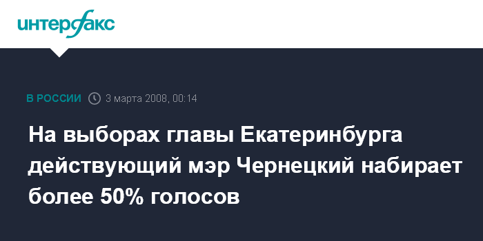 Екатеринбург. 3 марта. INTERFAX.RU - На выборах главы Екатеринбурга побеждает действующий мэр города Аркадий Чернецкий.
