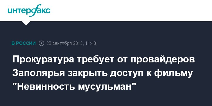 Мурманск. 20 сентября. INTERFAX.RU - Прокуратура Мурманской области потребовала от региональных интернет-провайдеров запретить доступ к скандальному видеофильму "Невинность мусульман".