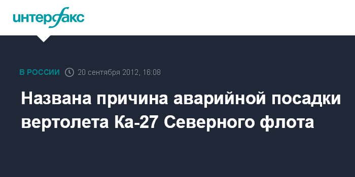 Североморск. 20 сентября. INTERFAX.RU - Причиной аварии вертолета Ка-27, который в четверг совершил жесткую посадку в восточной части острова Котельный архипелага Новосибирских островов, по предварительным данным, стал отказ техники.