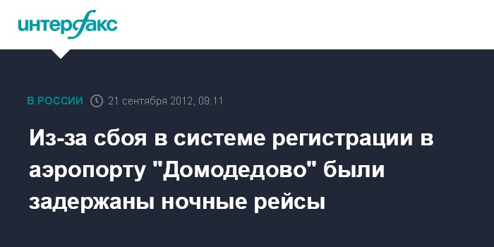 Москва. 21 сентября. INTERFAX.RU - В московском аэропорту "Домодедово" в четверг вечером были задержаны рейсы самолетов из-за сбоя в системе регистрации, сообщили "Интерфаксу" в справочной службе аэропорта.