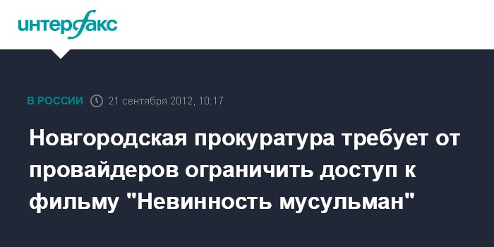 Новгородская прокуратура требует от провайдеров ограничить доступ к фильму "Невинность мусульман"