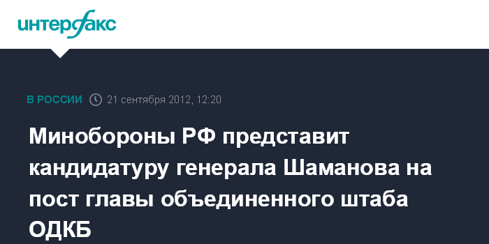 Минобороны РФ представит кандидатуру генерала Шаманова на пост главы объединенного штаба ОДКБ