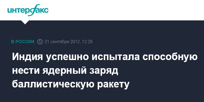 Дели. 21 сентября. INTERFAX.RU - Индийские военные в пятницу провели успешное испытание баллистической ракеты среднего радиуса действия Agni-III, способной нести ядерную боеголовку, сообщило местное телевидение.
