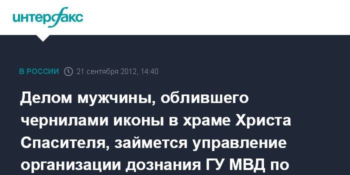 Москва. 21 сентября. INTERFAX.RU - Уголовное дело в отношении мужчины, облившего чернилами иконы в храме Христа Спасителя, передано в управление организации дознания столичной полиции, сообщил "Интерфаксу" в пресс-службе ГУ МВД России по Москве.
