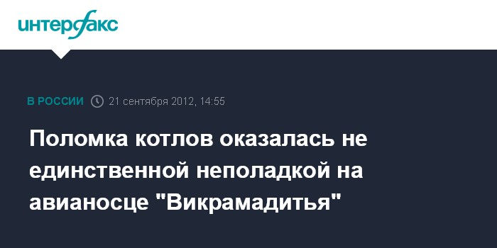 Москва. 21 сентября. INTERFAX.RU - Во время ходовых испытаний авианосца "Викрамадитья" в Белом и Баренцевом морях, кроме неполадок энергоустановки, выявлены неисправности и другого оборудования, сообщил в пятницу президент Объединенной судостроительной корпорации Андрей Дьячков в ходе доклада вице-премьеру Дмитрию Рогозину о ситуации с кораблем.