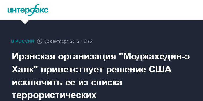 Москва. 22 сентября. INTERFAX.RU – Представители оппозиционной Организации моджахедов иранского народа ("Моджахедин-э Халк") приветствуют решение властей США убрать ее из списка террористических группировок, говорится в заявлении ее представителя, распространенном в субботу.