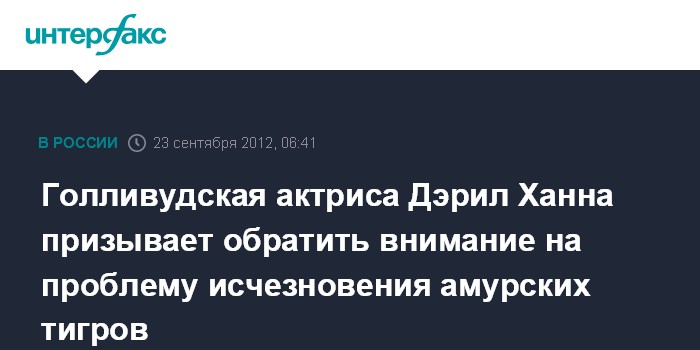 Владивосток. 23 сентября. ИНТЕРФАКС-ДАЛЬНИЙ ВОСТОК - Актриса Дэрил Ханна, знаменитая также своим участием в акциях в защиту экологии, сообщила журналистам во Владивостоке, что проблема исчезновения редчайших амурских тигров заслуживает пристального внимания общественности.