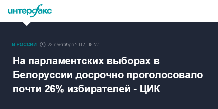 Минск. 23 сентября. ИНТЕРФАКС-ЗАПАД - В ходе досрочного голосования на парламентских выборах в Белоруссии за пять дней проголосовало почти 26% избирателей, сообщил агентству "Интерфакс-Запад" в воскресенье секретарь Центризбиркома Николай Лозовик.