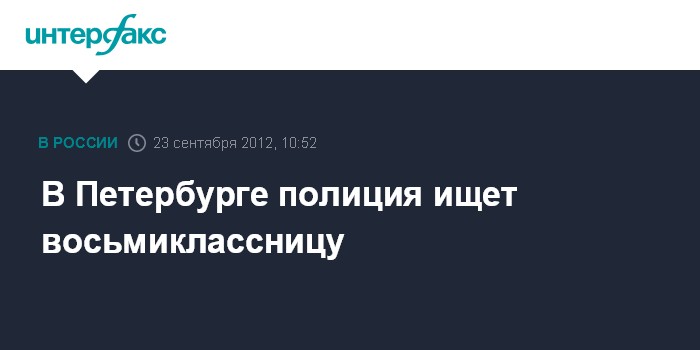 Москва. 23 сентября. INTERFAX.RU - Восьмиклассница пропала в Санкт-Петербурге четыре дня назад, полиция просит граждан помочь в поисках, сообщается в воскресенье на сайте ГУ МВД России по Санкт-Петербургу и Ленинградской области.