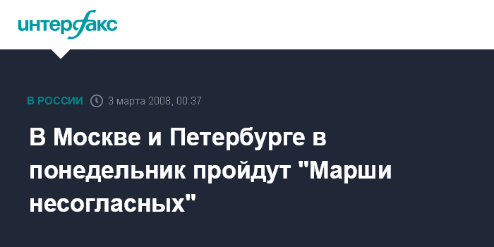 Москва. 3 марта. INTERFAX.RU - Коалиция "Другая Россия" планирует в понедельник провести "Марши несогласных" в Москве и Санкт-Петербурге.