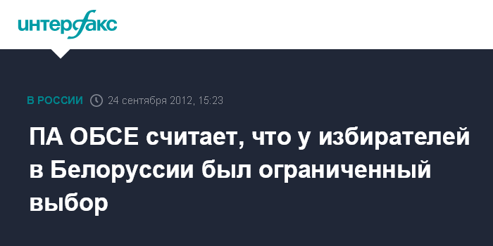 Минск. 24 сентября. INTERFAX.RU - Глава миссии краткосрочных наблюдателей от Парламентской Ассамблеи ОБСЕ на выборах в Белоруссии заявили об ограниченном выборе для избирателей на прошедших в воскресенье выборах в белорусский парламент.