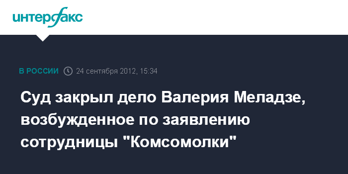 Москва. 24 сентября. INTERFAX.RU - Мировой суд района Арбат прекратил производство по делу частного обвинения в отношении певца Валерия Меладзе по заявлению о побоях фотокорреспондента "Комсомольской правды" Евгении Гусевой.