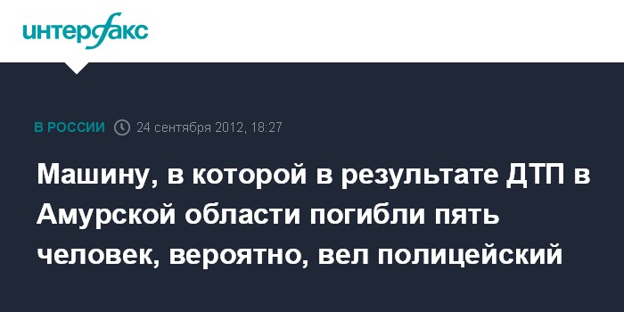 Москва. 24 сентября. INTERFAX.RU - По предварительным данным, за рулем машины, попавшей в ДТП в Амурской области, в котором погибло пять человек, находился сотрудник полиции.
