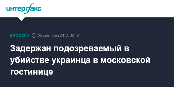 Москва. 25 сентября. INTERFAX.RU - Задержан мужчина, подозреваемый в убийстве гражданина Украины в гостинице на севере Москвы, сообщил "Интерфаксу" во вторник источник в правоохранительных органах.