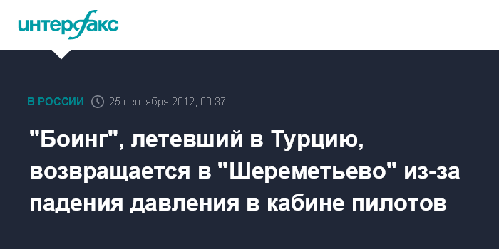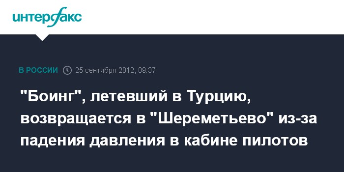 По словам собеседника агентства, самолет "Боинг-757" выполнял рейс "Шереметьево" - Даламан (Турция). "На высоте 10350 метров в 100 км южнее Калуги командир воздушного судна доложил о падении давления в кабине пилотов и о решении вернуться в аэропорт вылета", - сказал источник.