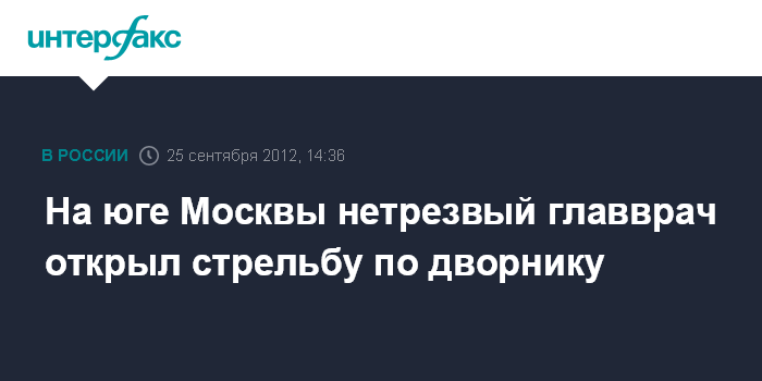 Москва. 25 сентября. INTERFAX.RU - Дворник попал в реанимацию после того, как его обстрелял главврач поликлиники восстановительного лечения N3 на юге Москвы, сообщил "Интерфаксу" источник в медицинских кругах.