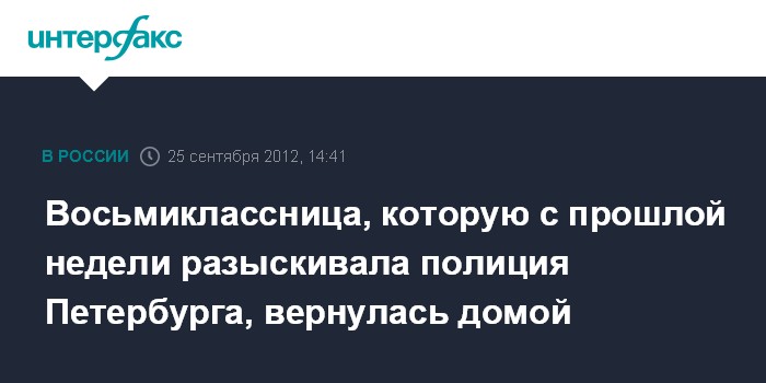 Санкт-Петербург. 25 сентября. INTERFAX.RU - Ученица 8 класса, находившаяся в розыске в Петербурге с прошлой недели, вернулась домой в понедельник днем, сообщил сайт ГУ МВД по северной столице.