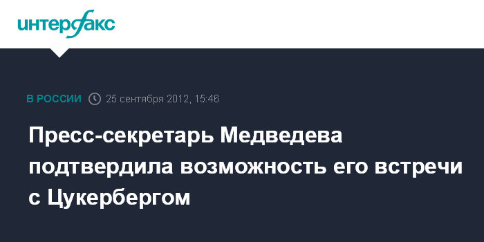 Москва. 25 сентября. ИНТЕРФАКС - Пресс-секретарь Дмитрия Медведева Наталья Тимакова подтвердила возможность встречи премьер-министра с основателем социальной сети Facebook Марком Цукербергом.