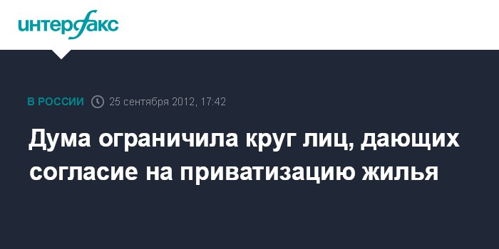 Москва. 25 сентября. INTERFAX.RU - Госдума на заседании во вторник приняла во втором и третьем чтениях закон, которым из круга лиц, дающих согласие на приватизацию жилья, исключаются граждане, которые уже реализовали свое право на приватизацию жилого помещения.