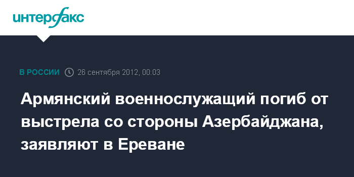 Ереван. 25 сентября. INTERFAX.RU - На границе Нагорного Карабаха и Азербайджана "в результате нарушения азербайджанской стороной режима перемирия убит армянский военнослужащий", сообщили во вторник в пресс-службе министерства обороны Армении.