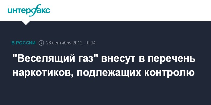 Москва. 26 сентября. INTERFAX.RU - Федеральная служба по контролю за оборотом наркотиков (ФСКН) планирует внести изменения в перечень наркотических средств, включив в него закись азота (так называемый "веселящий газ"), заявил в среду в ходе заседания Государственного антинаркотического комитета, глава ФСКН Виктор Иванов.