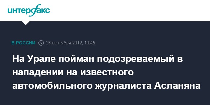 Москва. 26 сентября. INTERFAX.RU - Подозреваемый в нападении на известного автомобильного журналиста Сергея Асланяна задержан в Челябинской области сотрудниками МУРа, сообщил "Интерфаксу" представитель столичного розыска Алексей Бахромеев.