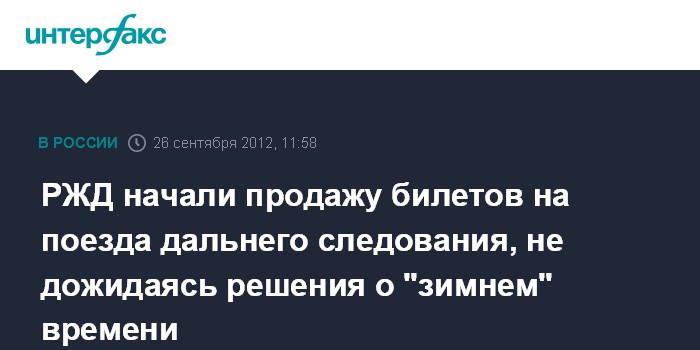 Москва. 26 сентября. INTERFAX.RU - ОАО "Российские железные дороги" (РЖД) открывает продажу билетов на поезда дальнего следования отправлением с 28 октября и курсирующих на тех внутрироссийских направлениях, где переход на "зимнее" время не повлияет на время отправления поездов с начальных станций, говорится в пресс-релизе железнодорожной монополии.