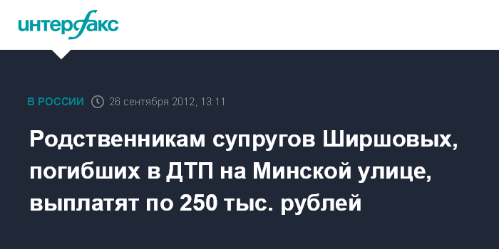 Родственникам супругов Ширшовых, погибших в ДТП на Минской улице, выплатят по 250 тыс. рублей