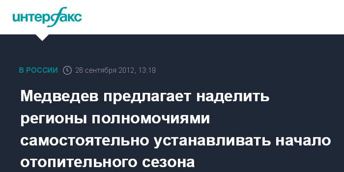 Москва. 26 сентября. INTERFAX.RU - Премьер-министр Дмитрий Медведев допускает возможность регионального подхода к методике, по которой определяется наступление зимнего отопительного сезона.