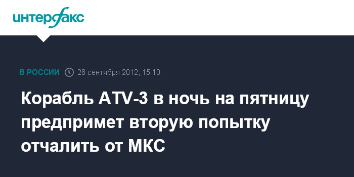Москва. 26 сентября. INTERFAX.RU - Европейский грузовой корабль ATV-3 попытаются отстыковать от МКС в ночь на пятницу, сообщили "Интерфаксу" в космической отрасли.