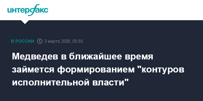 "В этот период, который по закону существует (до инаугурации - ИФ), мне бы хотелось заняться формированием будущих контуров исполнительной власти в стране. Это важная задача, достаточно сложная и трудоемкая", - заявил Д.Медведев в ночь на понедельник на пресс-конференции в своем избирательном штабе.