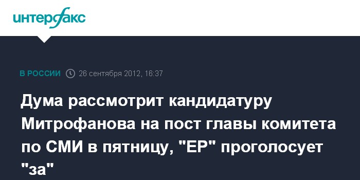 Москва. 26 сентября. INTERFAX.RU - Фракция "Единая Россия" не успела в перерыве пленарного заседания в среду рассмотреть ранее запланированный кадровый вопрос - о выдвижение Алексея Митрофанова на пост председателя комитета Госдумы по СМИ.