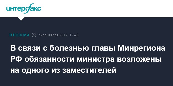 "В связи с моей болезнью, приказываю возложить с 24 сентября 2012 года исполнение должностных обязанностей министра регионального развития РФ на заместителя министра регионального развития Гаевского", - говорится в тексте приказа главы Минрегиона, поступившем в среду в распоряжение "Интерфакса".