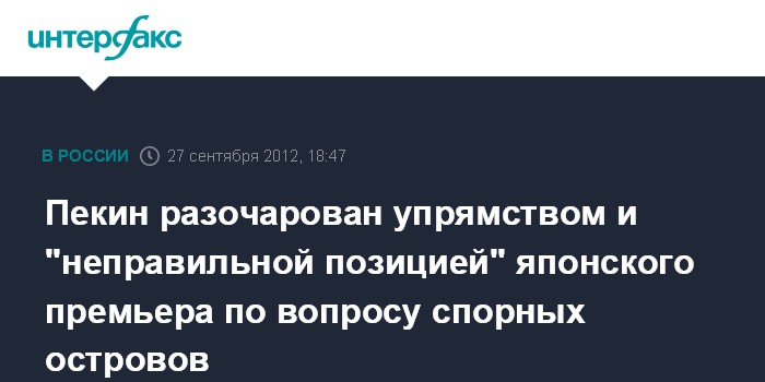 "Китай выражает сильное разочарование и заявляет жесткий протест в связи с упрямством японского лидера, занимающего неправильную позицию", - заявил Цинь Ган в ответ на высказывания Ноды на сессии Генассамблеи ООН о принадлежности островов Сенкаку.
