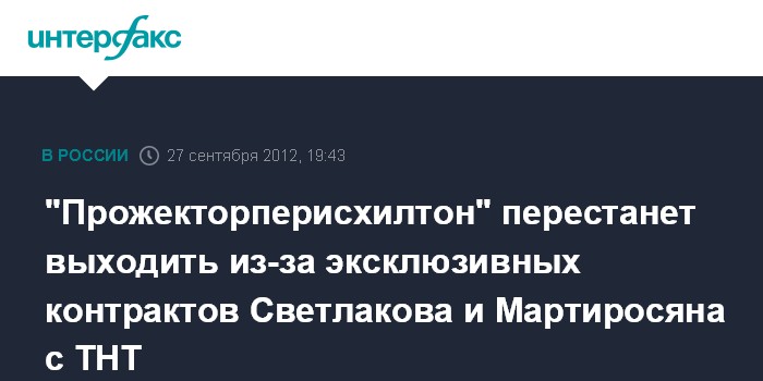 Москва. 27 сентября. INTERFAX.RU - Программа "Прожекторперисхилтон" перестанет выходить из-за условий контракта, заключенного между шоуменами Сергеем Светлаковым, Гариком Мартиросяном и телеканалом ТНТ, о которых на "Первом канале" было известно еще в прошлом году.