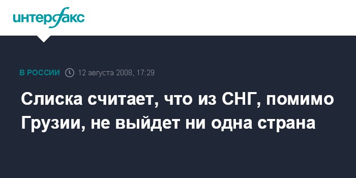 Москва. 12 августа. INTERFAX.RU - Вице-спикер Госдумы от фракции "Единая Россия" Любовь Слиска уверена, что ни одна из стран СНГ не последует примеру Грузии и не покинет Содружество. "Никто не будет его слушать, никто его не поддержит" - так прокомментировала Слиска "Интерфаксу" заявление президента Грузии М.Саакашвили, объявившего на митинге в Тбилиси о выходе из СНГ.