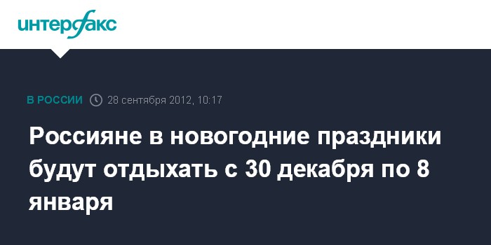 Москва. 28 сентября. INTERFAX.RU - Министерство труда и социальной защиты предложило установить десятидневную новогоднюю неделю на период новогодних праздников 2012-2013 года, а также пятидневный отдых в будущем году в связи с празднованием 1 мая и четырехдневный - по случаю 9 мая.