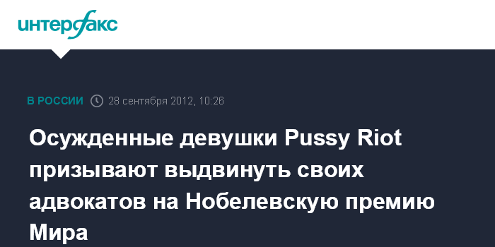 Москва. 28 сентября. INTERFAX.RU - Участницы панк-группы Pussy Riot, осужденные за скандальную акцию в храме Христа Спасителя, предлагают выдвинуть своих адвокатов на Нобелевскую премию Мира. "Мы призываем наших друзей и сторонников, депутатов парламентов свободных стран и культурных деятелей поддержать нас в выдвижении адвокатов Фейгина, Полозова и Волкову на Нобелевскую премию Мира", - говорится в рукописной копии письма, подписанного осужденными девушками, которая размещена в пятницу на одном из сайтов в поддержку Pussy Riot.