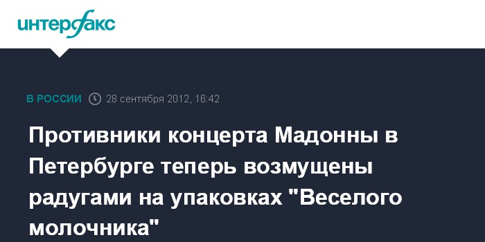 Санкт-Петербург. 28 сентября. INTERFAX.RU - В петербургском отделении общественной организации "Народный собор", известной своей борьбой с пропагандой гомосексуализма и протестами против выступлений Мадонны, возмутились внешнему виду упаковок торговой марки "Веселый молочник", на которых нарисованы радуги. "Это международный символ гомосексуального движения. Я считаю, что это открытая пропаганда порока", - сказал "Интерфаксу" в пятницу лидер отделения "Народного собора" Анатолий Артюх.