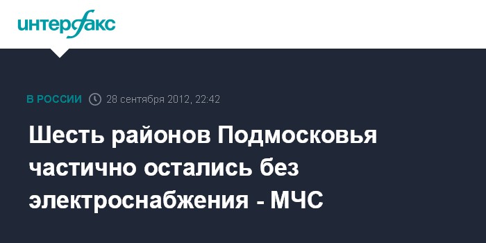 Москва. 28 сентября. ИНТЕРФАКС - Шесть районов Московской области из-за ухудшения погодных условий частично остались без электроснабжения, сообщили "Интерфаксу" в пятницу в подмосковном МЧС России.